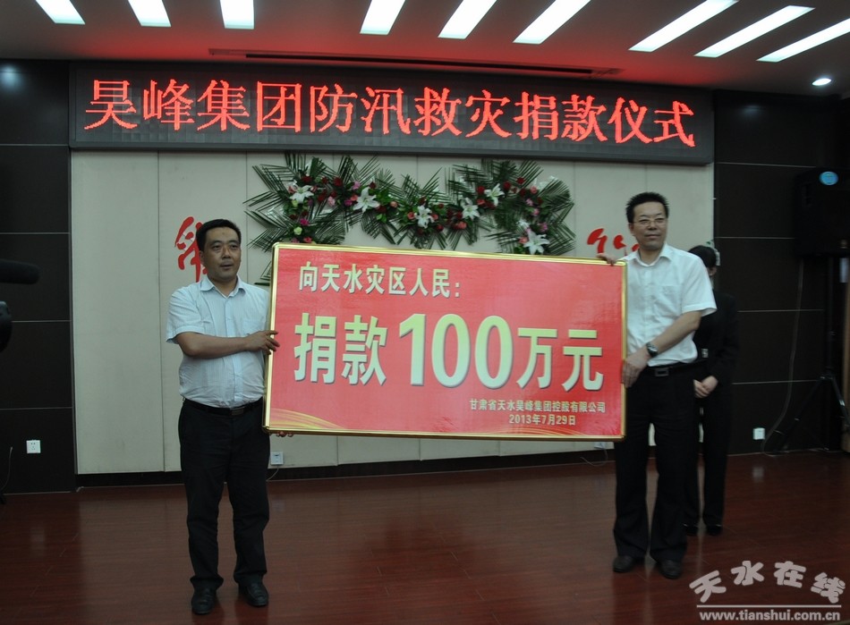 近期,我市接连遭受“6·20”、“7·8”和“7·21”、“7·25”四次特大暴洪灾害和甘肃岷县漳县6.6级地震波及灾害,给群众生产生活造成了巨大损失。灾难面前,昊峰集团迅速行动,积极响应由共青团天水市委、天水市青年联合会倡议,于7月29日举行防汛救灾捐款活动,为天水灾区捐款100万元。