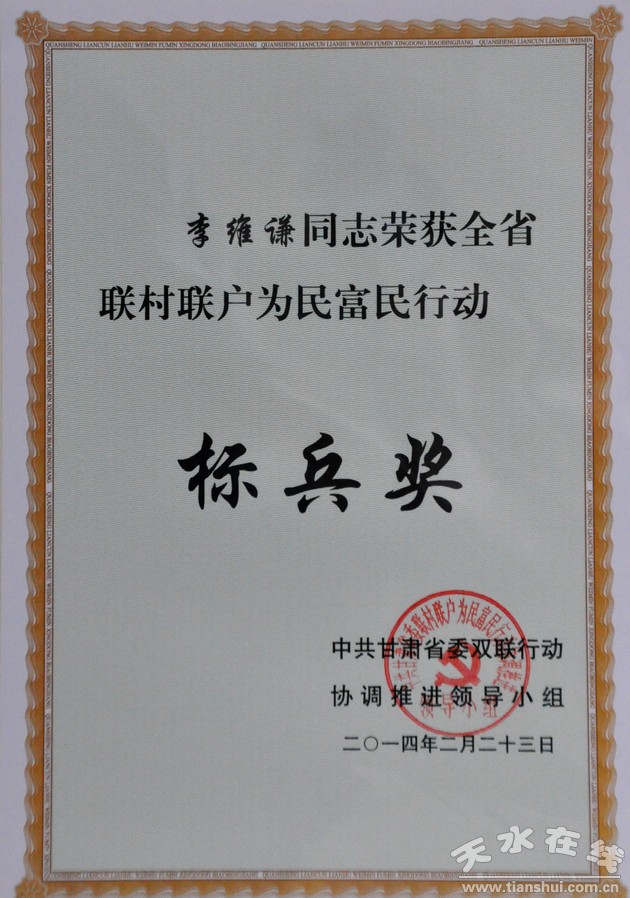 2月23日,甘肃省委在兰州召开“2014年全省联村联户为民富民行动大会”,表彰双联行动先进集体和个人。星火机床公司董事长李维谦荣获甘肃省“双联”行动“标兵奖”,受到大会表彰。