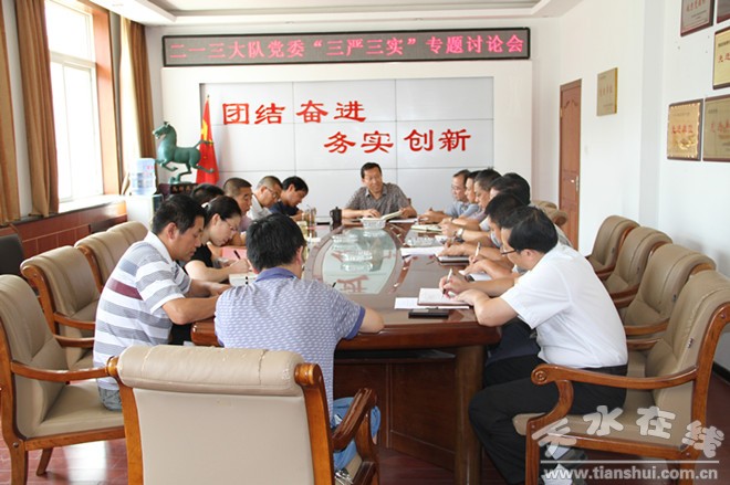 8月20日下午,甘肃省核地质二一三大队党委召开“三严三实”专题讨论会,在天水的大队领导,各党支部书记及政工办主任参加会议。会议由大队工会主席兼纪委负责人李国彪主持。会议学习了《习近平谈治国理政》一书中的《紧紧围绕坚持和发展中国特色社会主义学习宣传贯彻党的十八大精神》、《毫不动摇坚持和发展中国特色社会主义》篇目及《中纪委十八届五次会议公报》、《甘肃省研究部署党风廉政建设和反腐败等工作精神》、《甘肃省委举办“三严三实”专题教育党课王三运辅导报告》。