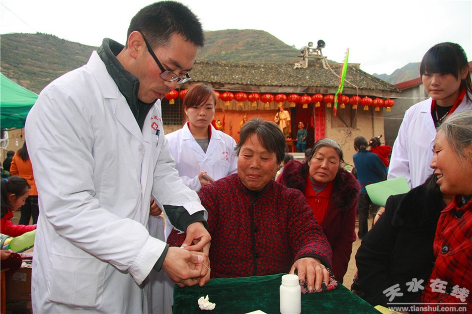 当天天水锻压医院院长、主治医师闫静率中医全科主治医师、中医针灸专家田小刚关门弟子苏旭东及医院医生和护士一行10人,一大早就来到了水关村庙会现场。村委会党支部书记王朝军、会长南海滨,热心人士南海军等及时安排相关人员进行了配合和协调。一进入现场,各种检测设备和器材都一一派上用场,很快村民们围到了义诊现场,有测量血压的,有需要开药的,有咨询的,还有需要按摩、针灸、中医理疗和扎针的,医生的医生们一一满足了就诊群众的需求。