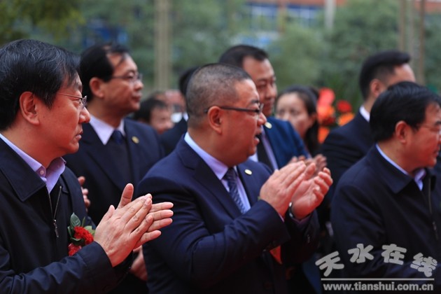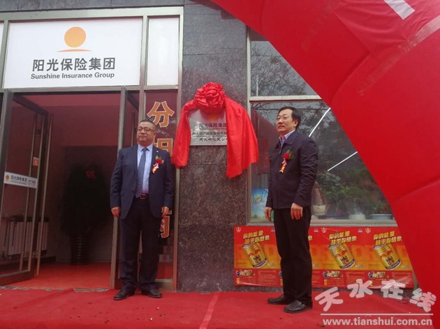 图为天水市金融办主任杨帆与阳光产险甘肃省分公司总经理郭朝晖为阳光产险天水中支揭牌