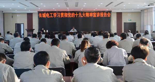 2017年11月30日,长城电工在天电集团召开党的十九大精神宣讲报告会,邀请天水师范学院马列主义学院讲师刘彩虹作了题为《新时代、新使命、新思想、新征程——十九大精神解读》的主题宣讲。会议由公司党委委员、纪委书记安建民主持,长城电工天电集团总部及所属子公司中层以上领导干部、党员共计180余人参加了会议。