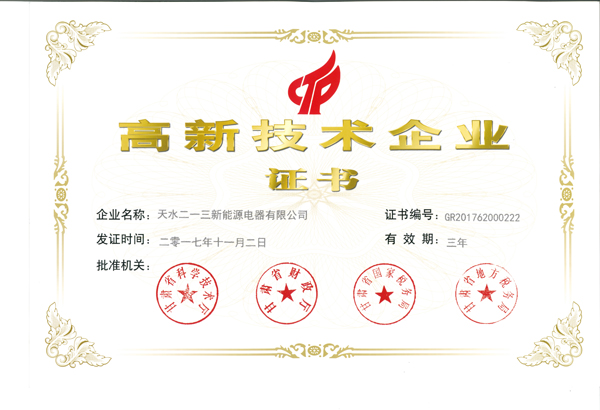 2017年11月, 长城电工天水二一三新能源电器有限公司被国家科技部认定为 “高新技术企业”,省科学技术厅、省财政厅、省国家税务局、省地方税务局联合颁发了证书。
