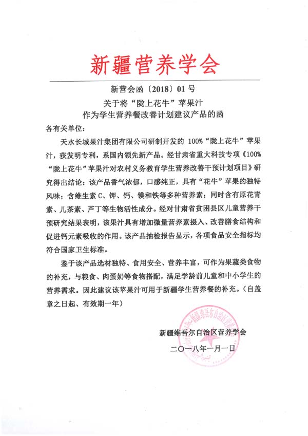1月1日,天水长城果汁集团有限公司“陇上花牛100%苹果汁”获得新疆营养学会推荐函。推荐函的取得,为长城果汁集团公司“陇上花牛100%苹果汁”今后在新疆各地区学校推广和配送学生“营养餐”奠定了良好基础。
