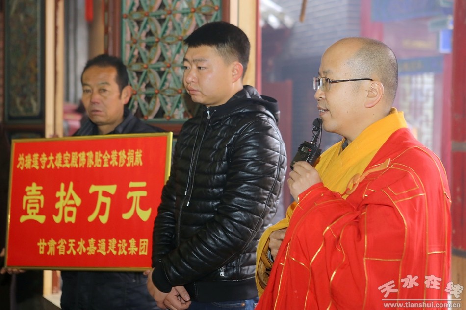 1月24日 ,腊八节,天水市秦州区瑞莲寺大雪纷飞,福瑞盈门。天水嘉通建设集团公司向瑞莲寺捐款仪式在这里隆重举行。同时,瑞莲寺还为嘉通建设集团公司举行了祈福法会。