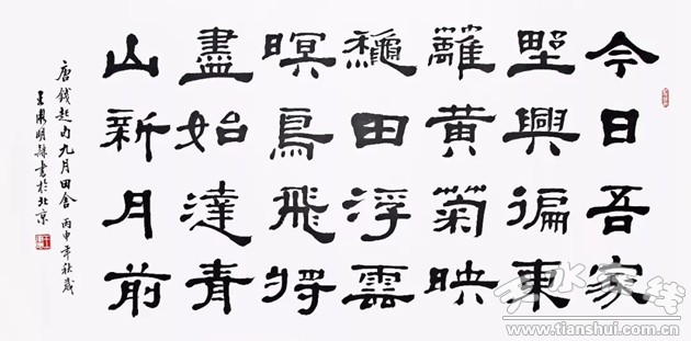 王卫明,1958年生于北京,祖籍山东蓬莱,四岁开始学习绘画,受吴作人、李苦禅先生热心指教,中央美术学院硕士,日本京都大学博士。现为中国书法家协会会员、北京书法家协会会员,日本美术史协会会员,日本京都橘女子大学文学部历史遗产学科教授、博士生导师。他的书法深得启功老师的指点,专攻隶书,遍临《曹全碑》、《礼器碑》、《史晨碑》、《乙瑛碑》、《张迁碑》、《华山庙碑》、《石门颂》、《西狭颂》、汉简、《瘗鹤铭》以及清代伊秉绶、近人王福庵等名帖墨迹。