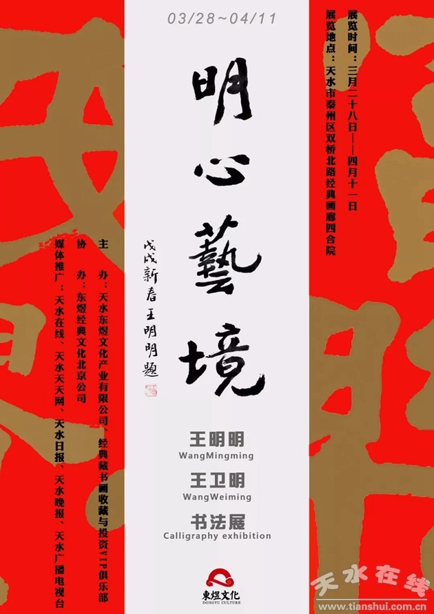 阳春三月,草长莺飞,伴着和煦的春风,“明心艺境——王明明、王卫明书法展”将于3月28日上午10:00在天水市经典画廊隆重开幕。本次展览选取王明明、王卫明书法作品30余幅,是对两位艺术家近期书法成果的一次集中展示。展览以学术性为宗旨、以艺术交流为目的,内容题材多为传统优秀词章及吉祥祝语,是一次传承中华优秀传统艺术、弘扬主旋律与时代精神的展览。