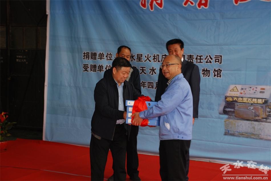 他说,今天,我们怀着激动的心情,像嫁姑娘一样把它捐赠给天水市工业博物馆,前期星火机床集团公司向市工业博物馆捐赠了原天拖厂生产的拖拉机,红山公司将要把500KG机械式天平送展,把它们放在工业博物馆这一更大的平台展示在世人面前,让更多的人通过它们了解星火,了解红山,了解天拖,了解天水市的工业发展,了解装备制造业的薪火传承。