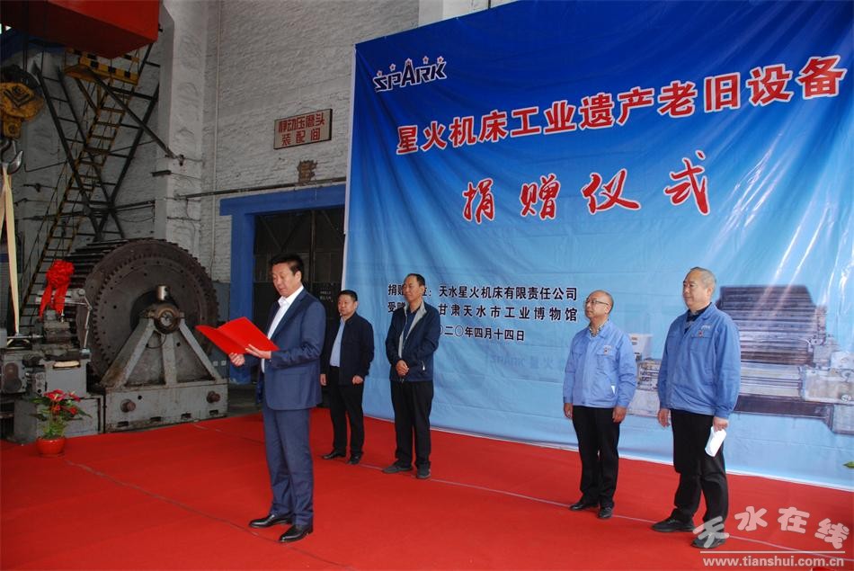 他说,今天,我们捐赠的TX-1001牙条车床是星火机床公司1973年自行研发设计的专用机床,用于满足当时的星火机床厂生产需要。这台设备为星火机床的发展立下了汗马功劳,见证了星火机床从无到有,从小到大的风雨历程,体现了星火人有条件要上,没有条件创造条件也要上的干事创业精神,可以说这台设备浓缩了星火发展历史,也浓缩了天水装备制造业的发展历史。