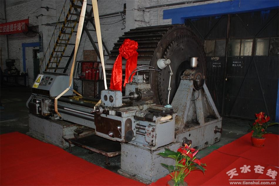 4月14日上午,星火机床机械制造公司精密大修车间气氛隆重而热烈,星火机床公司工业遗产老旧设备捐赠仪式在这里举行。捐赠现场的大红地毯上,星火机床公司1973年生产的产品TX-1001牙条车床身披鲜艳的红花,像一位待嫁的“新娘”,等待她的“婆家”天水市工业博物馆 “迎娶”回家。