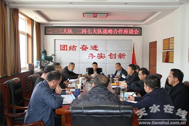 二一三大队大队长周定一、党委书记胡勇、副大队长席甲平、石有智、党委副书记李国彪及有关单位负责人参加座谈。