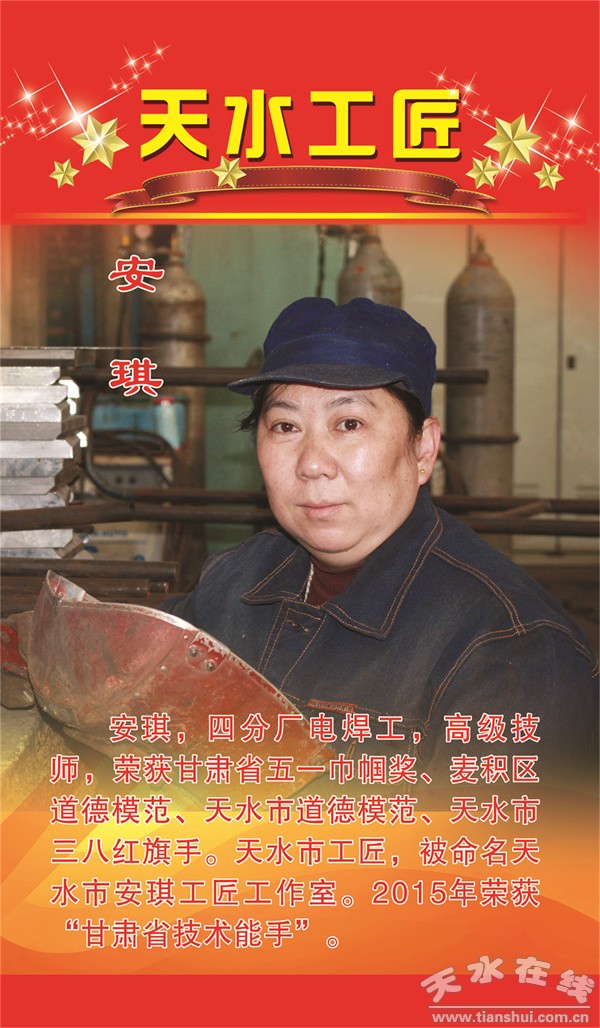 安琪,作为天水锻压集团的一名女电煤工,一上班就从事于电焊工作,电焊看上去是男同志都望而却步的工种,安琪却毫不犹豫的选择了它,并且一干就是28年,28年来,她始终把电焊当作自己的一项神圣的职业来对待,她说:“电焊本是良心活动,一丝一毫都不能马虎,要对得住用户和企业,更要对得住自己的良心。”她始终坚持“条条焊缝、表里如一”的理念,在工作中创造了不凡的业绩,更为企业的高质量发展作出了巨大的贡献,为此,她也多次获得各项荣誉,多年来被集团公司评为“三八红旗手”、“天水锻压劳模”、“天水工匠”、“天水市三八红旗手”、“甘肃省三八红旗手”、“甘肃省五一巾帼奖”、“甘肃省技术能手”、“甘肃省劳动模范”,她于2021年纪念建党100周年之际光荣的加入了中国共产党。