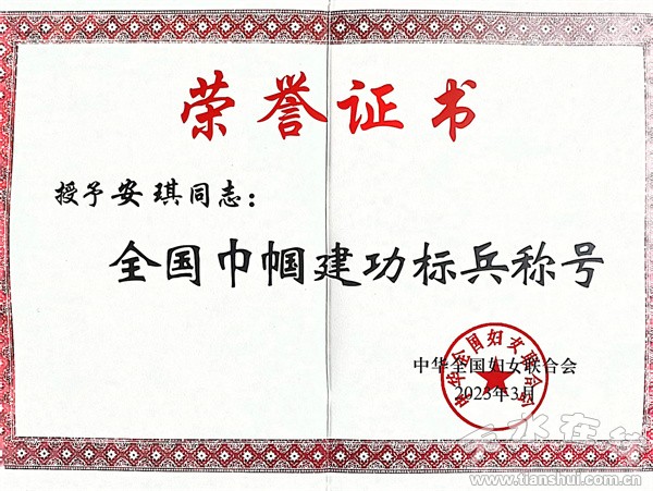 这次获得“全国巾帼建功标兵”既是她个人努力奋斗的结果,也是组织对她的多年培养,这次经过层层推荐,她的事迹得到了上级组织的认可,为此授予天水锻压机床(集团)有限公司女电焊工安琪“全国巾帼建功标兵”荣誉称号,受到了表彰奖励。
