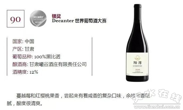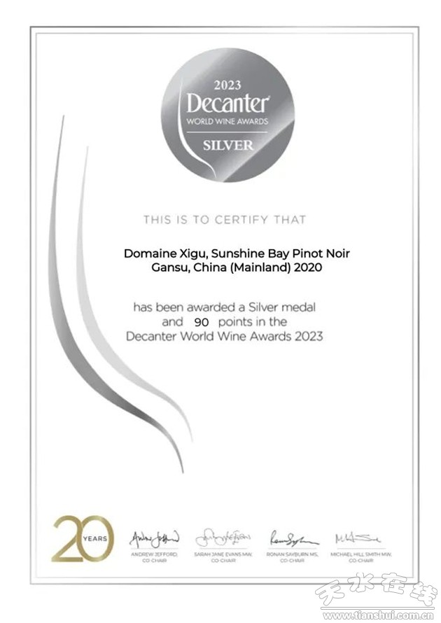 世界最大规模的葡萄酒赛事——Decanter世界葡萄酒大赛(Decanter World Wine Awards)近日发布第20届赛事的结果。来自甘肃天水曦谷酒庄的曦谷黑皮诺干红葡萄酒(2020)和阳湾黑皮诺干红葡萄酒(2020)双双获得银奖,分别为91分和90分。