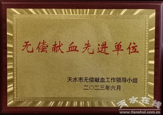 6月12日,在第20个“6·14世界献血者日”来临之际,天水市举行纪念“世界献血者日”暨无偿献血颁奖大会。会议对全国无偿献血奉献奖终身荣誉奖、全国无偿献血志愿服务奖终身荣誉奖和全国无偿献血奉献奖代表颁发了“全国无偿献血先进市”荣誉证书和“全国无偿献血促进奖单位奖”奖牌。