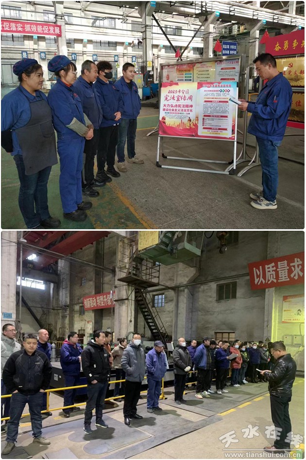 12月1日,集团公司组织召开了会议,对开展宪法宣传做了周密安排,并集中学习了宪法精神。会后,各单位、部门通过班前班后会议、LED电子显示屏、书法撰写等大力宣传宪法精神,并在工作群内宣传普及了宪法的相关知识。12月4日,组织开展了“宪法,我想对您说”视频宣传,并进行了宪法精神宣讲活动。甘肃省劳动模范、集团公司四分厂电焊工安琪,第三届天水工匠、集团公司第一联合分厂镗工董小军分别现身说法,进一步增强了宣传力度和宣传效果。