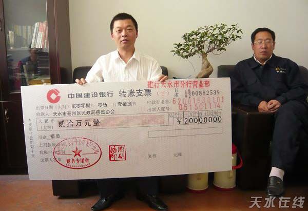 (秦州区委宣传部 裴振刚)带着对秦州人民的关心和慰问,5月18日,李子金矿为该区捐款20万元人民币。市委常委、秦州区委书记张健在接受捐款时说,虽然灾难无情,人却有情,他代表全区人民对李子金矿和全体员工表示衷心感谢,并表示尽快把这批款项用于最需要救济的受灾地方。
