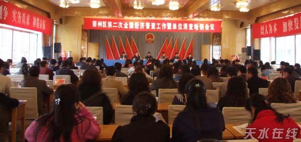 10月24日,秦州区召开第二次全国经济普查工作暨单位清查培训会,天水市统计局纪检书记苟钟灵,市普查中心主任彭德川,秦州区委常委、组织部长李鹏凡,区人大副主任马有魁,区政府副区长何宝平及区第二次经济普查领导小组各成员单位负责人,各乡镇、街道办事处经济普查领导小组组长、办公室主任、业务骨干和区经普办全体工作人员,共计180多人参加了会议。会议的主要内容是安排部署经济普查及单位清查工作,与各乡镇、街道办事处签订经济普查目标责任书,对各乡镇、街道办事处业务骨干进行培训。会议还表彰奖励了全区第二次全国农业普查先进集体和先进个人。