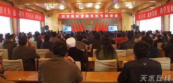 (秦州区委宣传部 裴振刚) 11月28日,秦州区举行应对国际金融危机专题讲座,来自兰州大学经济学博士、经济学院副教授、硕士生导师、中国战略规划网专家成员、甘肃省中小企业国家银河培训工程专家李泉就国际金融危机的成因及对经济的影响、金融危机的表现形式等及我国应对国际金融危机出台的一系列宏观政策作了专题讲解。