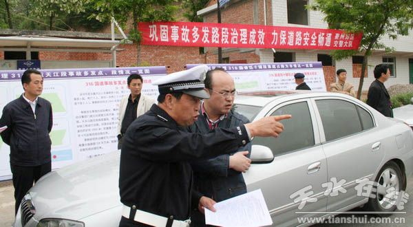 5月12日,由国家安全生产监察专员陈茂生带队,公安部、交通运输部、国家安全监管总局、保监会派员参加的部际联席会议“平安畅通县区”检查组一行5人和省公安厅交警总队副总队长钟山等,在天水市委常委、政法委书记韩岱成,市委常委、纪委书记、副市长杨维俊,市委常委、秦州区委书记张健,市长助理、市公安局局长吕淙江,市政府副秘书长杨胜利,市创建“平安畅通县区”领导小组办公室主任、市公安局副局长、交警支队支队长霍秦生,秦州区委副书记、区长周伟及市、区两级公安、交警、交通、运管、安监、教育、农业、广电、建设等相关部门负责人的陪同下,通过听取汇报、翻阅资料、实地查看等形式,对天水市秦州区创建“平安畅通县区”工作进行了考评。