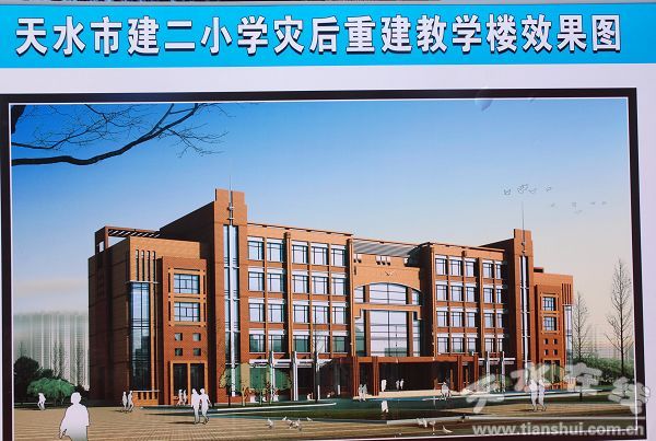 建二小学始建于1937年,占地面积4835平方米,建筑面积3291平方米。“5·12”地震使学校建于1984年的主教学楼严重受损,被建设、质检部门鉴定为危楼,已于2008年6月拆除。灾情发生后,在有关部门的协调下,学校将学生分流到罗玉中学和电大天水分校上课,维持了正常的教育教学秩序。共青团甘肃省委、甘肃省青少年发展基金会还积极伸出援助之手,在罗玉中学搭建活动板房教室28间,建成“天水市建二抗震希望小学”一所,暂时解决了1800名学生的上学问题。同时,各级党委政府积极筹措资金,先后争取到省民政厅捐赠资金1200万元、德国政府援建资金73万欧元用于学校灾后重建,秦州区政府又筹措800多万元用于扩大校园面积,征地3401平方米。新建的教学楼为四层(局部五层)框架结构,建筑面积6152.7平方米,造价约1200万元,抗震设防烈度按8度防设,并采用国际、国内领先的隔震技术。教学楼内设标准化教室、多媒体教室、微机室、图书阅览室等,功能齐全,设施一流。