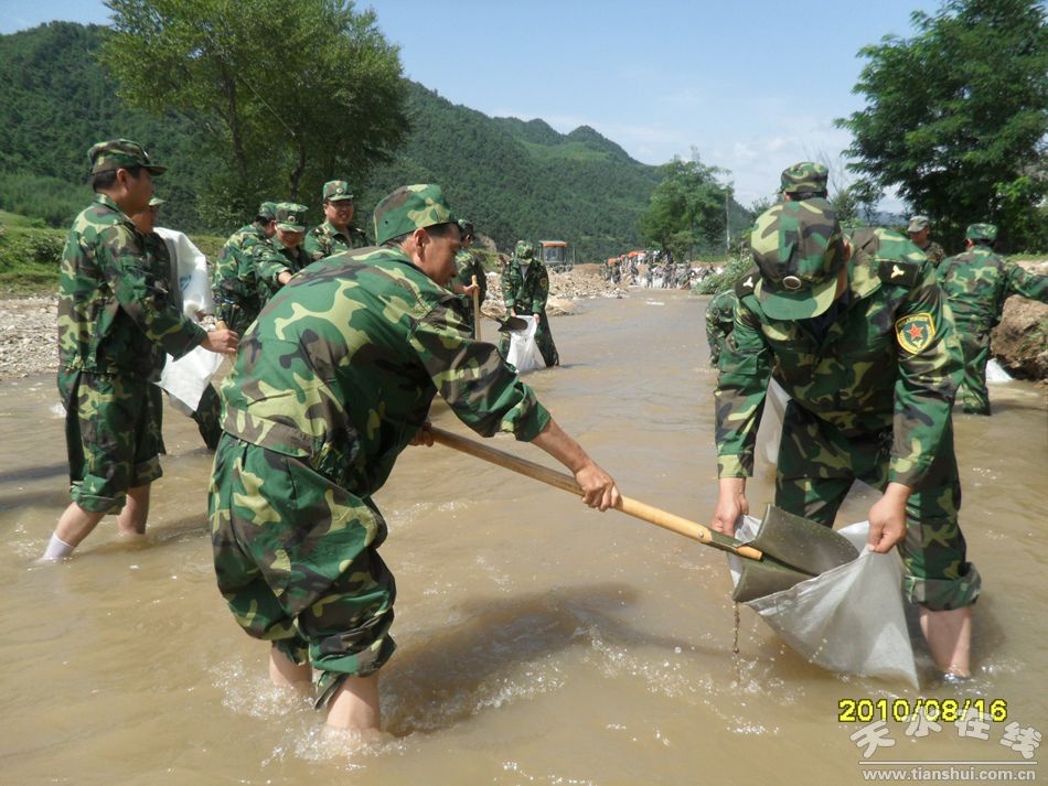 (秦州区外宣办)8月中旬,天水市50个乡镇普降暴雨和大暴雨,秦州区娘娘坝镇降雨量达171毫米。娘娘坝镇钱家坝、柳林村23户村民院落进水,11人被困,1人受伤,部分房屋被淹,望天沟门村供电中断,杜家村受灾严重,沿路20多处水毁,李子矿区3人死亡,2人受伤,8人失踪。一串串令人担心的数据从兄弟乡镇娘娘坝传来,中梁乡党委政府高度重视,在做好本乡防洪防灾工作的同时,密切关注娘娘坝镇的抢险救灾恢和复生产工作,在天旅工兵营的统一部署下,迅速组织天水预备役筑城连30名官兵奔赴娘娘坝镇受灾最为严重的花园村抢险救灾,谱写了一曲一方有难、八方支援、齐心协力、共克时艰的动人赞歌。