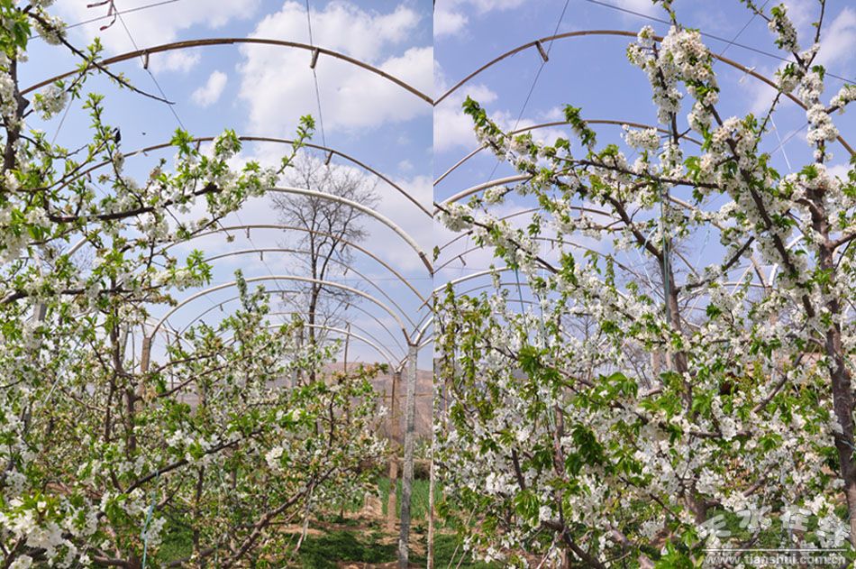 去年4月,正值果树开花时节,秦州区遭遇了罕见的霜冻灾害,给果品产业带来严重的影响,导致果品大量减产,特别是大樱桃几近绝收,群众损失惨重。影响樱桃产量的主要因素是早春霜冻,在开花期,如果遇到1℃以下的低温天气,花芽受冻害率达96%—98%,由此便会导致大幅度减产甚至绝产。高架大棚技术利用大棚的保温、隔霜效果,可以有效避免大樱桃在开花期受低温霜冻天气影响,保证果树坐果率,提高果品产量。