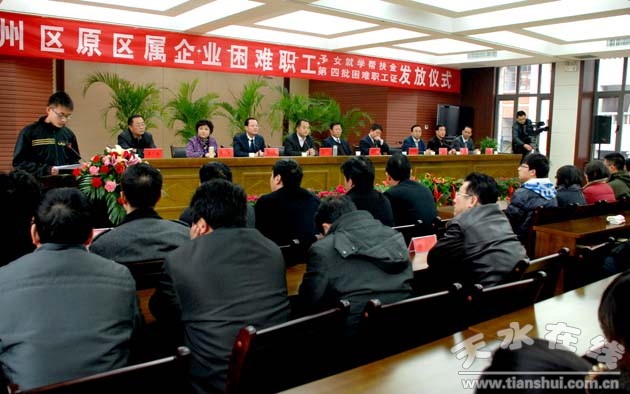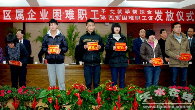 在发放仪式上,对2011年考入大学的11名困难职工子女叶敏、李炜、马祥龙、张欢、王斌等困难职工子女,根据《秦州区原区属企业困难职工救助帮扶暂行办法》规定,考取重点院校的按8000元标准、考取本科院校的按5000元标准、考取大专院校的按2000元标准一次性发放救助帮扶金6.1万元,同时,对符合救助条件的第四批救助帮扶困难职工代表11人发放了困难职工证。困难职工子女大学生代表李炜做了表态发言,他表示将认真学习,刻苦钻研,用感恩的心和优异的成绩回报社会。