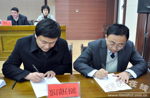 会上,区委常委、副区长武建成宣读了《天水市人民政府关于表彰完成2011年度市政府目标管理任务先进县区的决定》;区委常委、常务副区长张宪泉代表区政府与47个政府部门、单位及7个街道办事处签订了2012年区政府目标管理责任书。