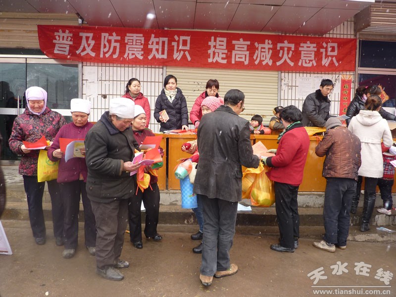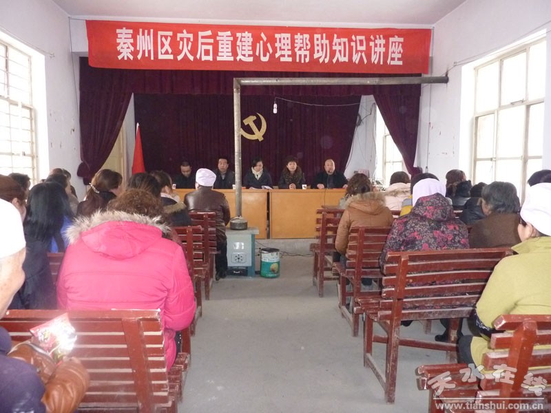 (秦州区妇联 于小群)3月8日,秦州区灾后重建心理援助知识讲座及宣传咨询活动在娘娘坝镇举行。区妇联主席崔丽霞、地震局局长许维东、项目专职咨询师李艳艳,娘娘坝镇政府干部及娘娘坝村、金池村等村的部分村民共90余人聆听了讲座,前来赶集的300余人参加了宣传咨询活动。讲座由娘娘坝镇党委副书记、镇长郭世奇主持。
