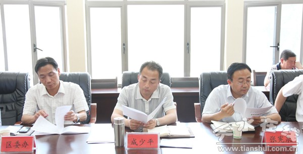 区委副书记成少平,区委常委、常务副区长张宪泉以及区委办、政府办、联络接待处、财政局、招商局、建设局、人社局、民政局、文广局、林业局、卫生局、工信局、交通局、玉泉镇待部门负责人参加会议。会议由成少平主持。