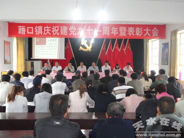 (秦州区外宣办)6月26日,藉口镇召开建党91周年庆祝大会。镇党委班子成员,机关全体干部,镇属各支部负责人,预备党员代表,受表彰的先进基层党支部、优秀党务工作者和优秀共产党员参加会议。
