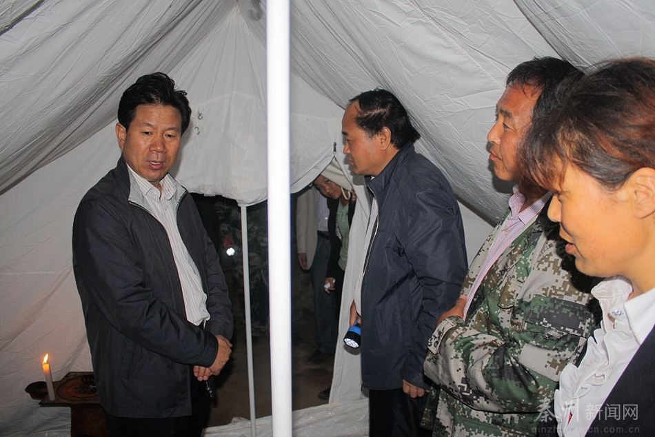 在柳林村集中安置点,张明泰走进刚刚搭建好的帐篷中,看望了受灾群众。他勉励大家,要振作起来,配合抢险抗灾人员,积极开展生产自救,再建美好家园。
