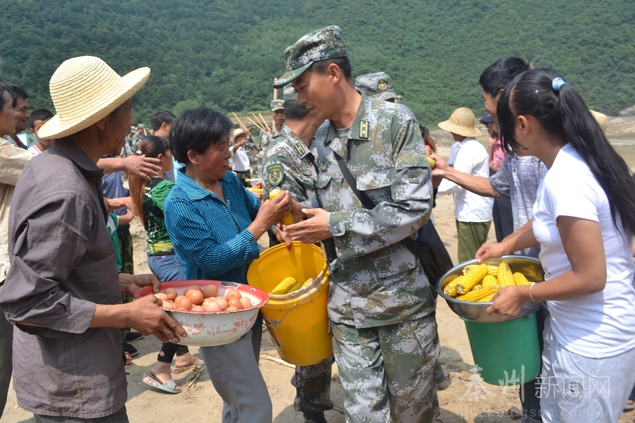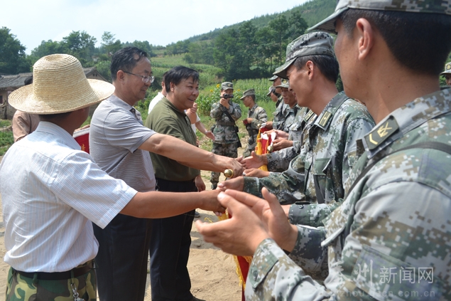 (秦州区外宣办 张永宏)8月6日,秦州区领导刘小平、许亚军、李广鸣等来到娘娘坝镇上长村,代表区四大组织为钢铁红军师送上锦旗,感谢他们连日来为娘娘坝抢险救灾工作做出的突出贡献,对全体官兵不辞劳苦的精神和心系灾区的情怀表示由衷的钦佩。在得知部队要调离的消息后,当地村民自发组织,手捧煮熟的鸡蛋和玉米棒等夹道相送,大家依依不舍,军民情深。