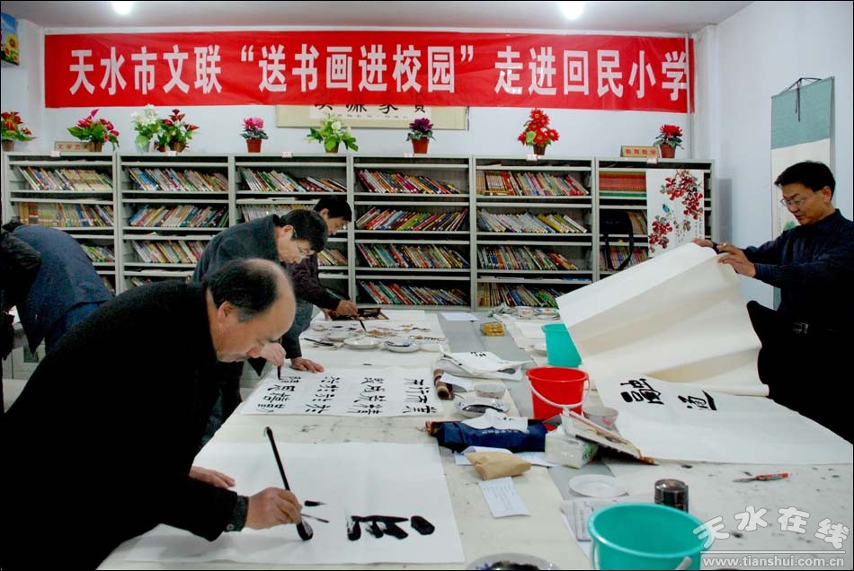 11月15日下午,市文联组织我市著名书画家来到天水市秦州区回民小学开展“送书画进校园”活动。 广大师生通过与书画家的交流,感受了经典,陶冶了情操,提高了审美,一幅幅书画家们精心创作的作品成为校园文化当中的一道永恒的风景线。
