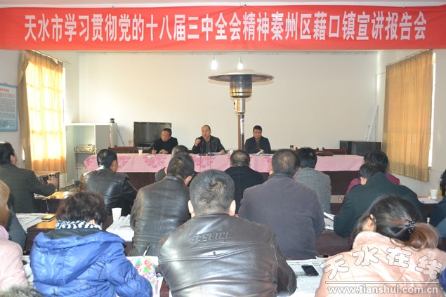 (秦州区外宣办)12月10日,天水市学习贯彻党的十八届三中全会精神宣讲报告会在秦州区举行。天水行政学院副教授赵具安,市委党校副教授王彦飞分别在区委礼堂和藉口镇作了宣讲报告。 区四大组织在家领导,区委中心组成员,各乡镇、区直各部门、驻区各单位副科级以上干部,藉口镇干部职工、村支部书记、镇属各单位负责人及部分党代表、人大代表、村民代表共400余人聆听了宣讲报告。