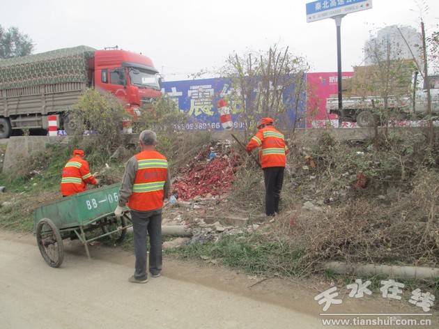 二是大力开展城市背街小巷、城乡结合部环境卫生治理。以清除枯叶杂草、砖瓦石块为重点,投入大型垃圾压缩车1辆,翻斗车1辆,手推式垃圾收集车17辆,人力120余人次,集中清理了山水嘉园周边、电缆厂周边、王家磨周边、藉河河堤沿线等地带枯叶杂草、砖瓦石块7车次、50余吨。以清理背街小巷、城乡结合部死角垃圾为重点,投入铲车1辆、翻斗车3辆,人力220余人次,大规模清理东方红、东十里、石马坪、长低厂背后等死角垃圾7处、200余吨。