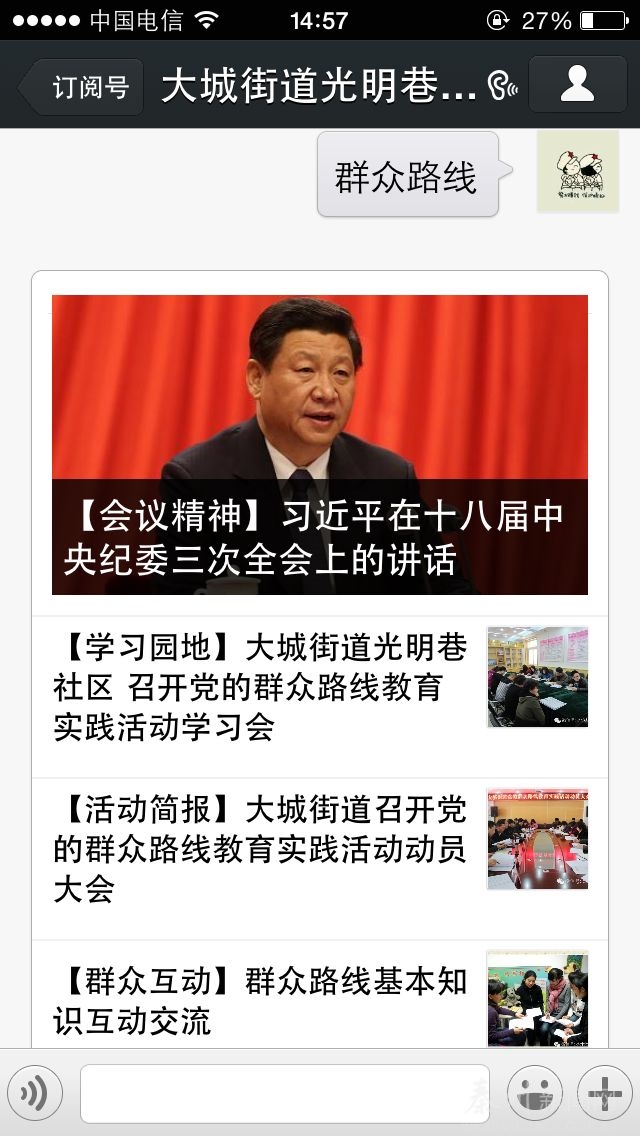 自党的群众路线教育实践活动开展以来,大城街道光明巷社区为适应新形势的需要,积极探索创新活动载体,方便群众学习了解和监督党的群众路线教育实践活动,让辖区在外流动党员更好地参与教育实践活动,在社区官方微信服务居民群众平台上开辟了党的群众路线教育实践活动专栏,以更加“便民、利民”的“网上”平台开展党的群众路线教育实践活动。