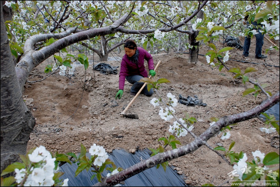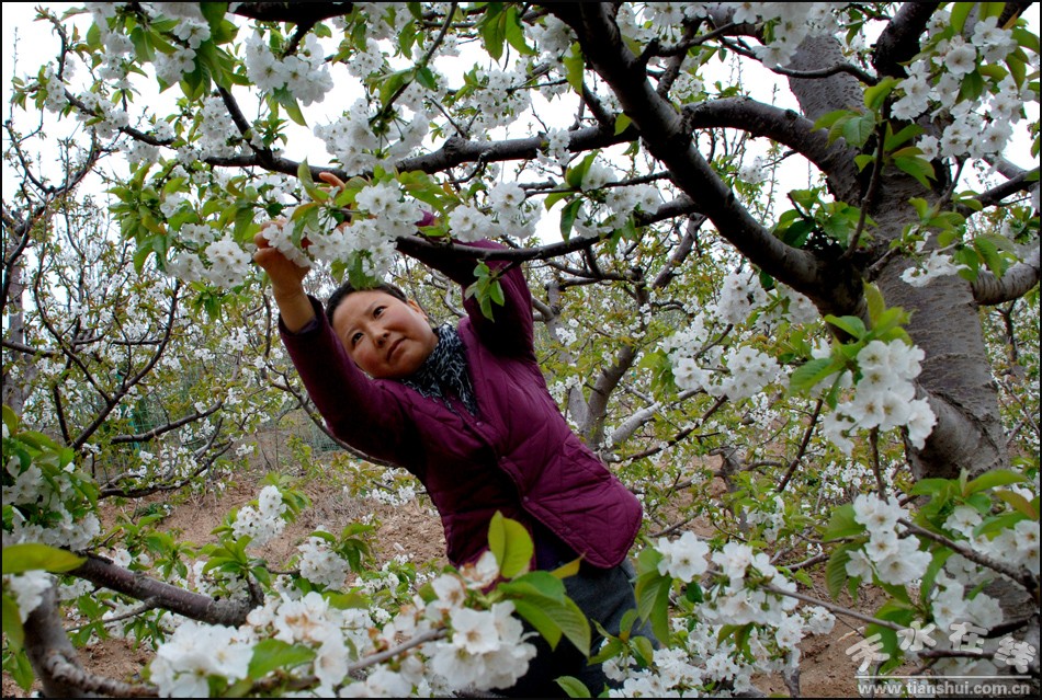 4月15日,秦州区玉泉镇烟铺村村民张顺芳在为自家的樱桃树疏花。