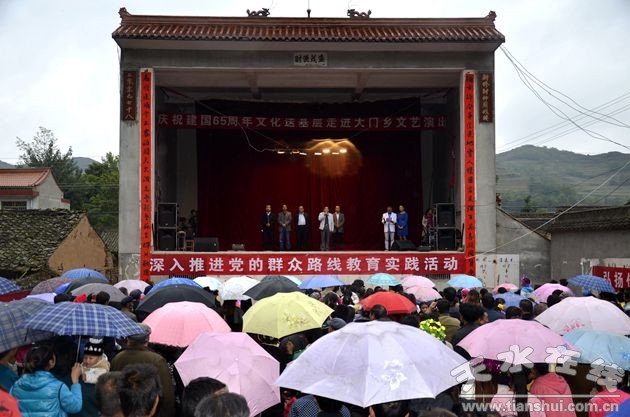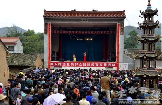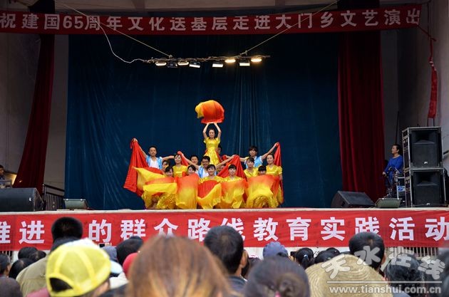 金秋时节,瓜果飘香,到处一片丰收的景象。在喜迎建国65周年之际,9月27日,由中共秦州区委宣传部、秦州区文化广播影视局、秦州区大门乡人民政府主办,秦州区文化馆承办的秦州区庆祝建国65周年文化送基层走进大门乡文艺演出在大门乡拉开序幕,演出活动吸引了大门乡附近近千名群众观看。