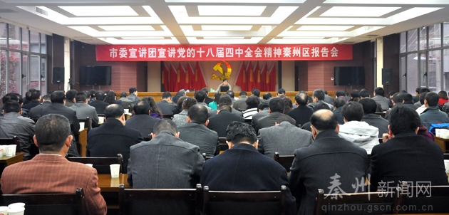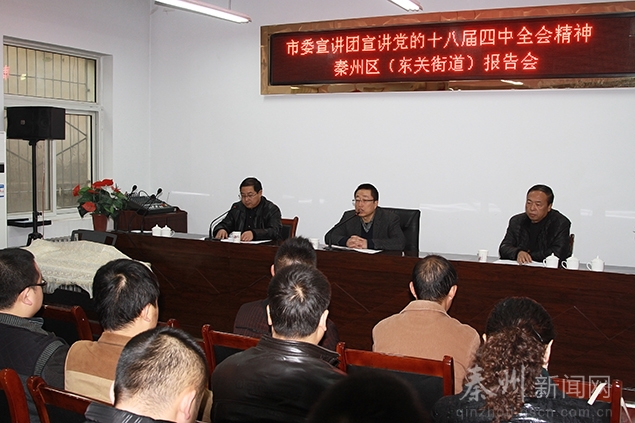 为深入学习宣传贯彻全会精神,更好地把广大党员干部群众的思想和行动统一到全会精神上来,把智慧和力量凝聚到推进社会主义法治建设上来,为全面建成小康社会提供有力法治保障、创造良好法治环境。11月26日,由市直宣教系统纪检组长王再盛,市委宣传部理论科科长张耀进,市委党校法学教研室主任、副教授唐云龙,市委党校副教授郭文娣一行4人组成的市委宣讲团宣讲党的十八届四中全会精神秦州区报告会在秦州区委礼堂和东关街道分别举行。