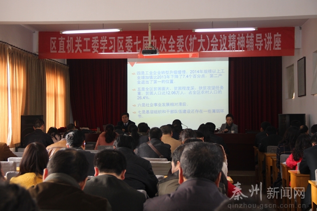 (秦州区外宣办)3月9日上午,秦州区在区委党校举办区委七届九次全委(扩大)会议精神培训班。区直属机关工委所属各党总支、支部书记、副书记,各单位党务工作者,部分党员代表共200人参加了辅导讲座。