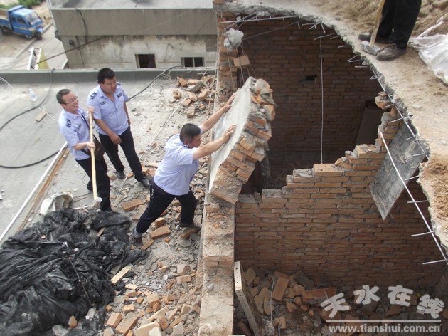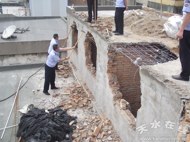 近日,秦州区执法局机动一中队执法人员在执法巡查中发现,皇城路桥头加油站西侧正在建设三层的砖混结构房屋,经过现场调查,了解该房屋是姚某家在自家原有二层基础上加盖第三层,姚某建设该房屋并没有到相关单位办理审批手续。执法人员立即对该行为予以制止,并下发了《责令限期改正通知书》,责令当事人限期拆除。