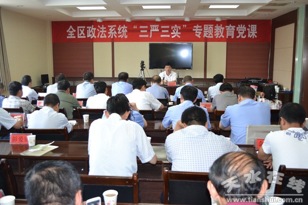 6月17日,秦州区政法系统举办“三严三实”专题教育党课。区委常委、政法委书记赵虎生同志以《认真践行“三严三实”,打造过硬政法队伍》为题,作了专题辅导报告,并对全区政法系统及分管联系部门开展专题教育进行安排部署。区委政法委、区法院、区检察院、区公安分局、区司法局、区环保局、区工信局、区城管执法局等部门班子成员共40余人参加了党课学习。