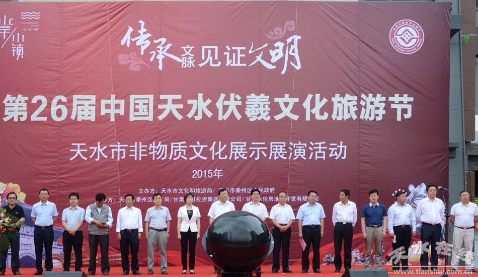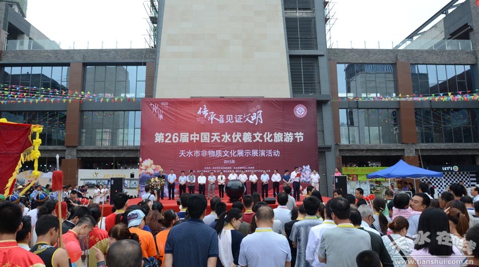 6月20日上午,以“传承文脉、见证文明”为主题的2015年天水市非物质文化遗产展示展演活动在佳•水岸小镇开幕。市领导雷鸣、刘来生、温利平、张克强及秦州区四大组织领导文月平、何东、宋丕林、毛更生、李继明、刘小平、王晓彤出席开幕式。