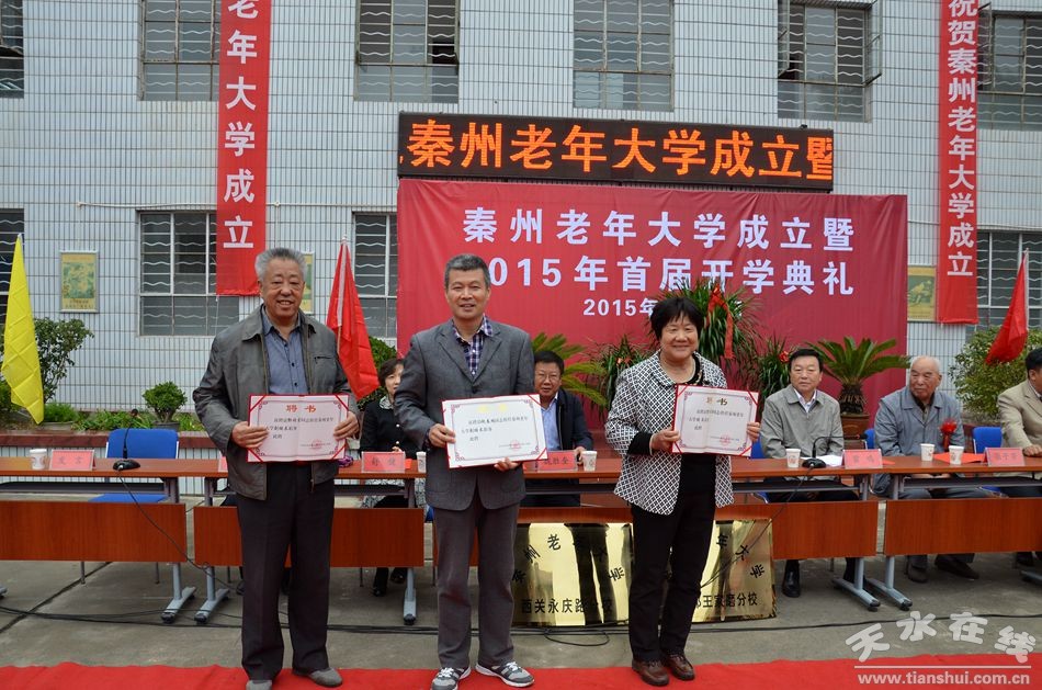 开学典礼上,秦州区相关领导宣读了关于成立秦州老年大学的批复及老年大学校领导班子聘任通知并发放聘任证书,同时为秦州大学三个分校授牌。