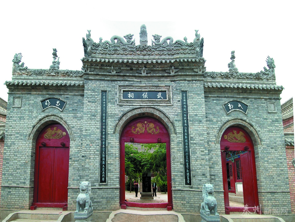 在木门村旁,远远就能看见花木丛中的“武侯祠”若隐若现。从山下拾级而上,仰头便是半拱红门,左右两侧是砖雕长联。进得青砖仿古山门,整个建筑庄严肃穆,周围山体绿树成荫,鸟鸣啁啁,庭院遍植花草树木,显得幽雅而静谧。新落成不久的武侯祠一院三进,第一进为照壁过厅;第二进为武侯祠,正殿塑诸葛亮像,东西厢房塑文臣武将像;第三进为先主殿,塑刘备像。先主殿有联:“破黄巾,救青州,丹心力扶汉鼎;逆乌浪,伐碧眼,白帝空余蜀魂。”对刘备一生作了形象概括。