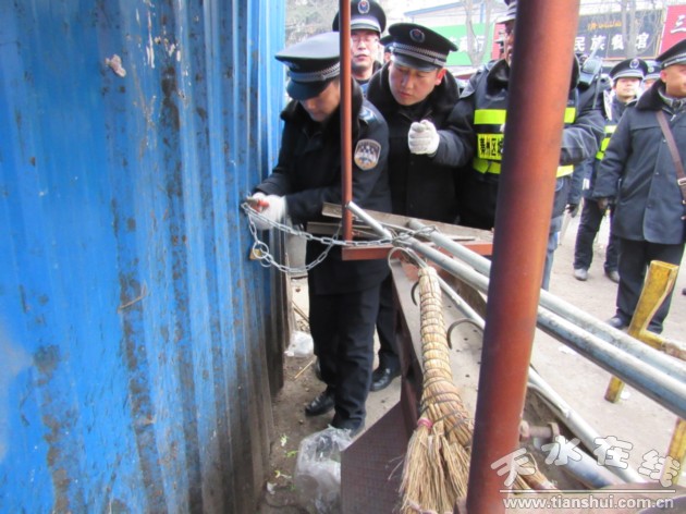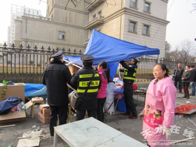 1月12日,秦州区执法局出动执法车4辆、执法人员50人,对罗玉小区马路市场进行了集中整治,共劝导自行搬离摊点5家,依法取缔摊点27家,清理乱堆物料7处,拆除乱搭乱建帐篷53顶。