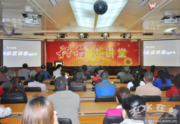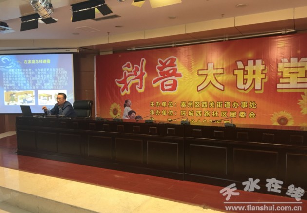 在我国第十一个防灾减灾日到来之际,为增强社会防灾减灾意识,普及全民防灾减灾知识和避灾自救技能。 5月12日上午,由秦州区西关街道办事处主办、环城西路社区居委会承办的以“减少灾害风险,建设安全城市”为主题的社区“科普大讲堂”在天水407医院多功能厅举行,讲座标志着西关街道社区四大讲堂之一的“科普大讲堂”正式开讲。