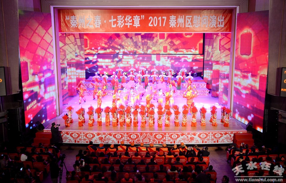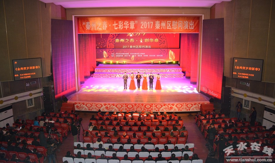 1月19日晚,“秦州之春·七彩华章”2017年秦州区慰问演出在秦州剧院举行。《金鸡贺岁迎新春》《中国范儿》等13个节目舞出了春回大地的喜庆,唱出了万象更新的欢腾。观众们在这场精美的视听盛宴中辞旧迎新,收获着心灵触动。市领导王光庆、张明泰、王军、雷鸣、李晓东、张克强观看演出。